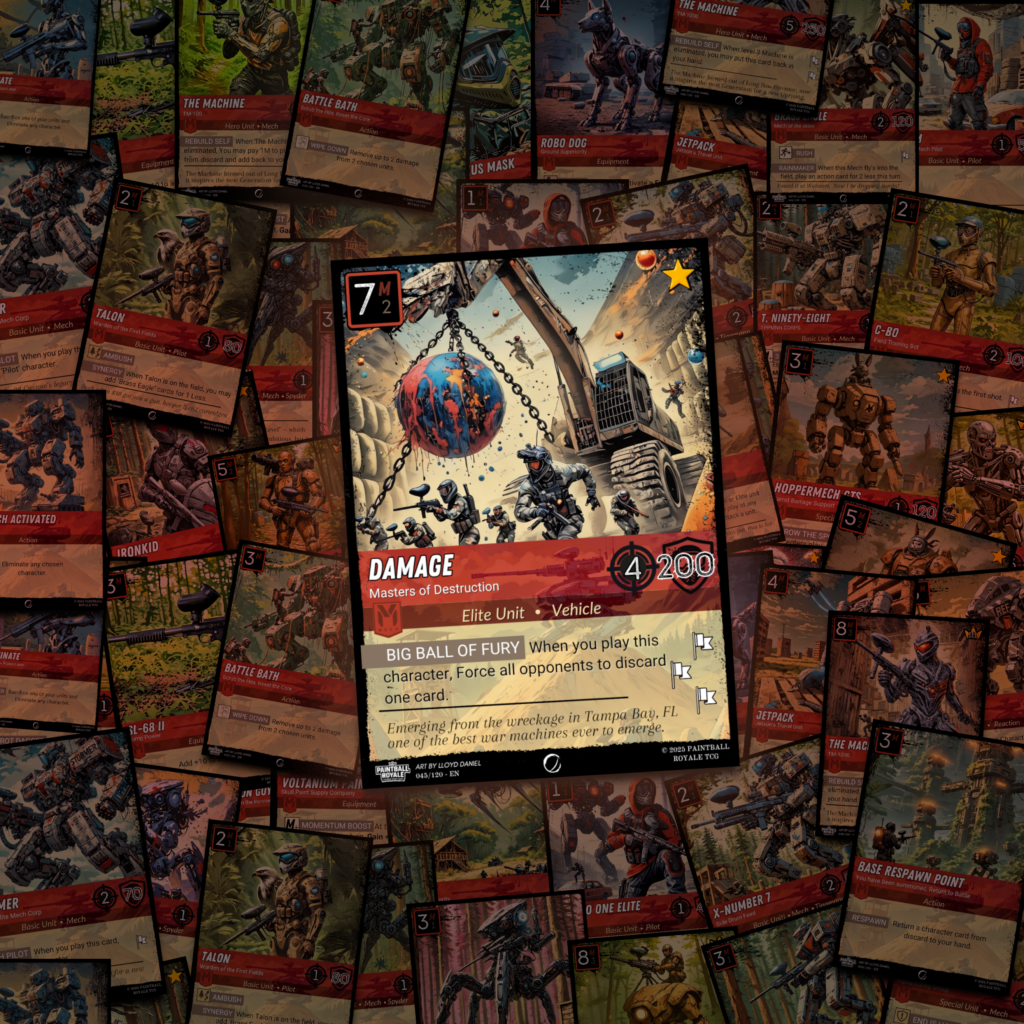 Paintball Royale is a deck-building trading card game built from the full history of paintball. Collect brands, gear, and legends from across decades, and hold the world of paintball in your hands to play, collect, and trade. Every card tells a story—from the early days of the sport to its high-tech future—featuring real markers, iconic teams, and a few wild twists along the way.